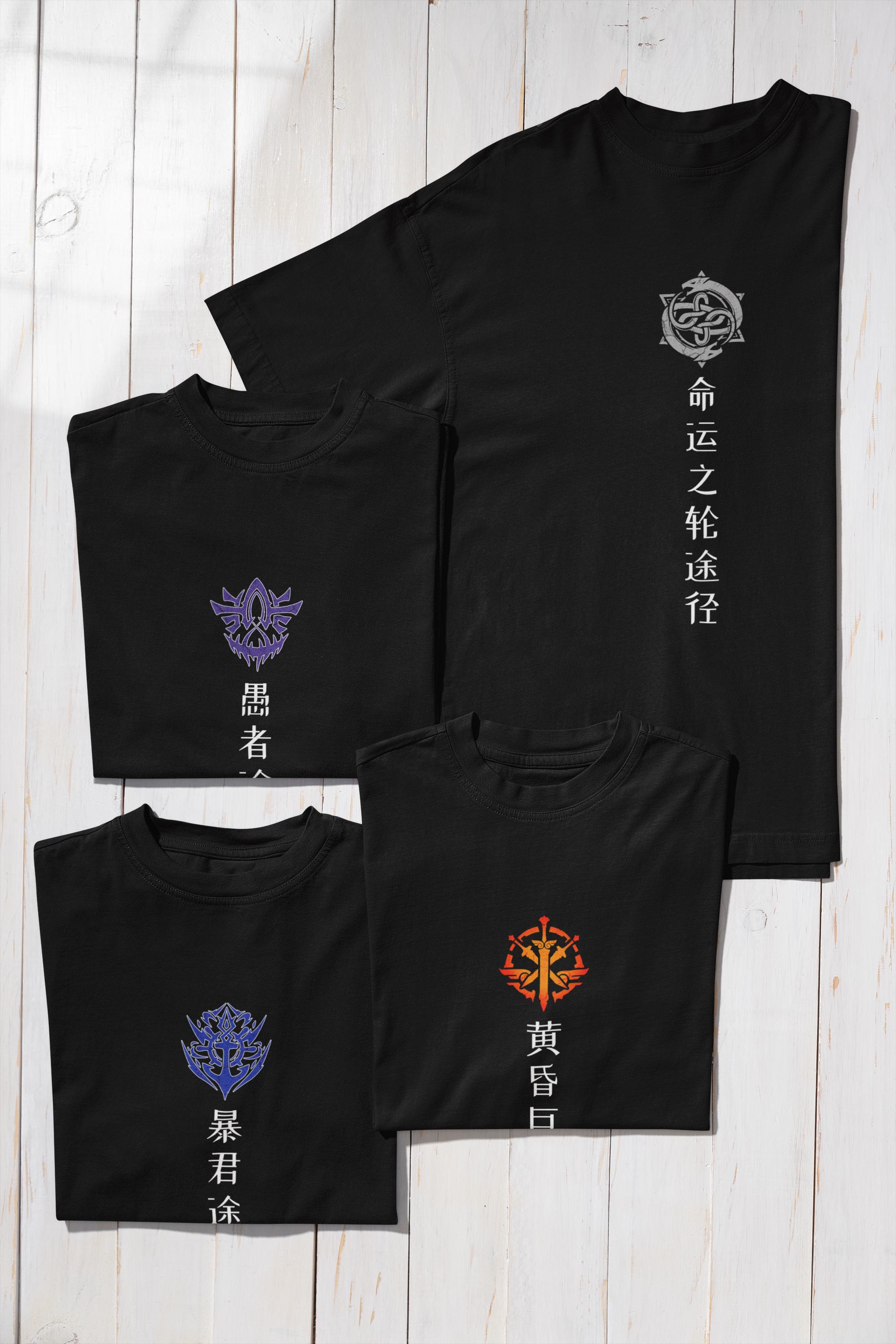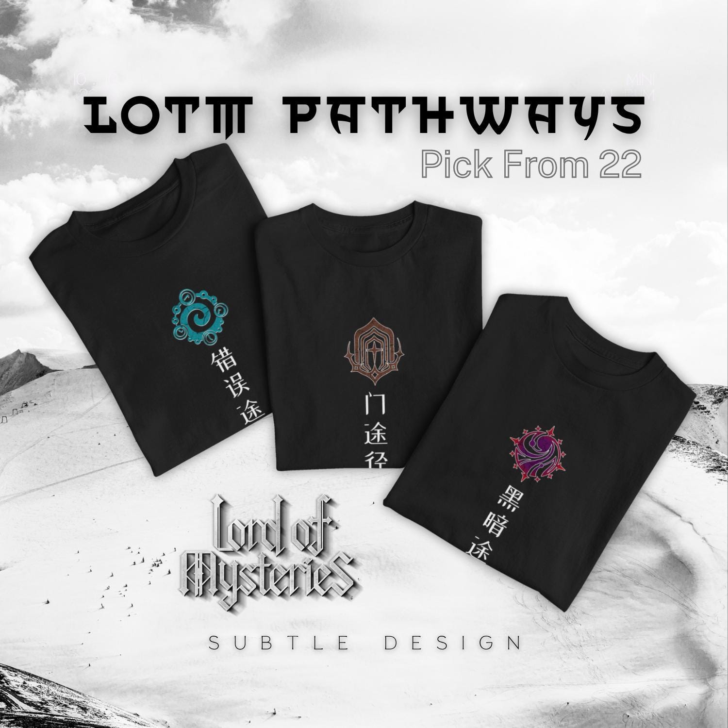 22 Unisex shirts inspired by the 22 beyonder pathways of Lord of the Mysteries. Each design shows a Path of the Divine symbol on the chest with the pathway name in simplified Chinese. The sleeves are styled with the Sequence Zero names in English and sequence 9 names in Loenese. Choose your Pathway from the variation menu, and pick your t-shirt size as well (S–5XL). Made on 100% cotton shirts and professionally produced for lasting quality
